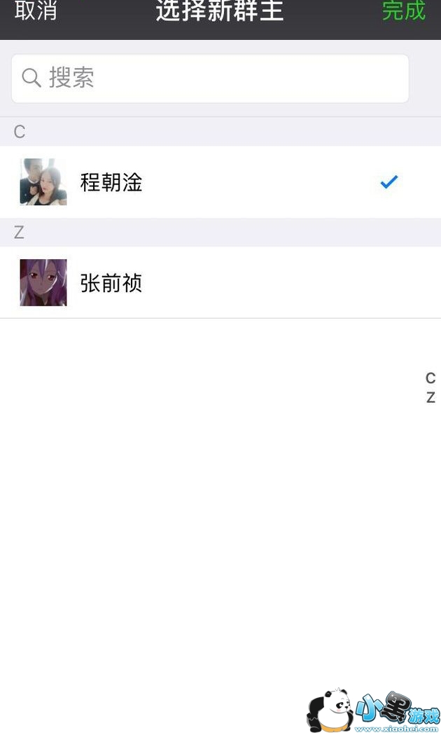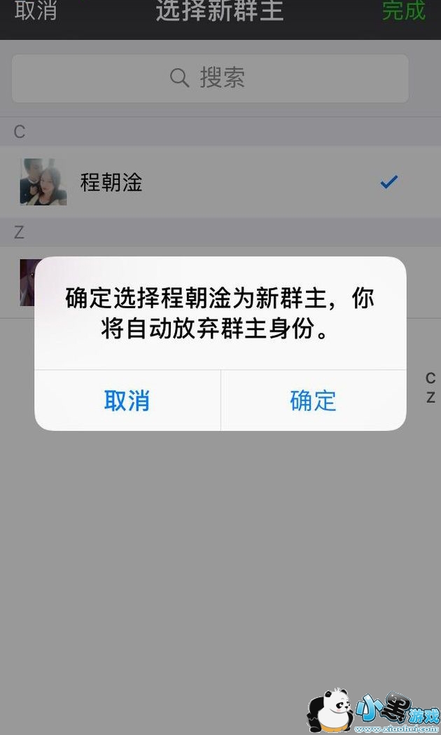 7、在选择新群主的界面,把它转让给帮忙的好友,然后再点击“完成”按钮。