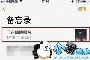 4、当照片存储到备忘录之后,进入手机备忘录操作界面,找到存储在备忘录的照片。