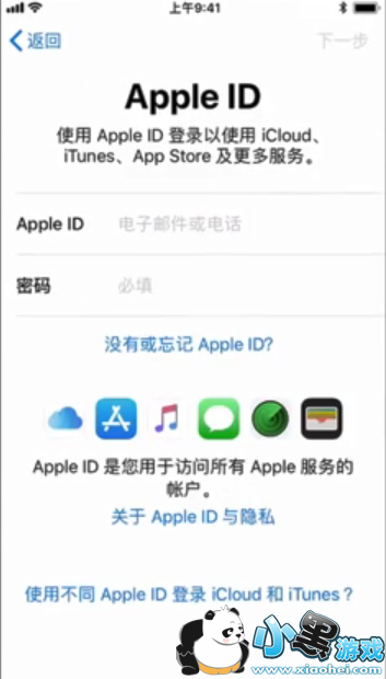 6、接着就会进入到Apple ID,登陆你的账号,如果没有的话就创建一个新的账户点击【没有或忘记Apple ID】
