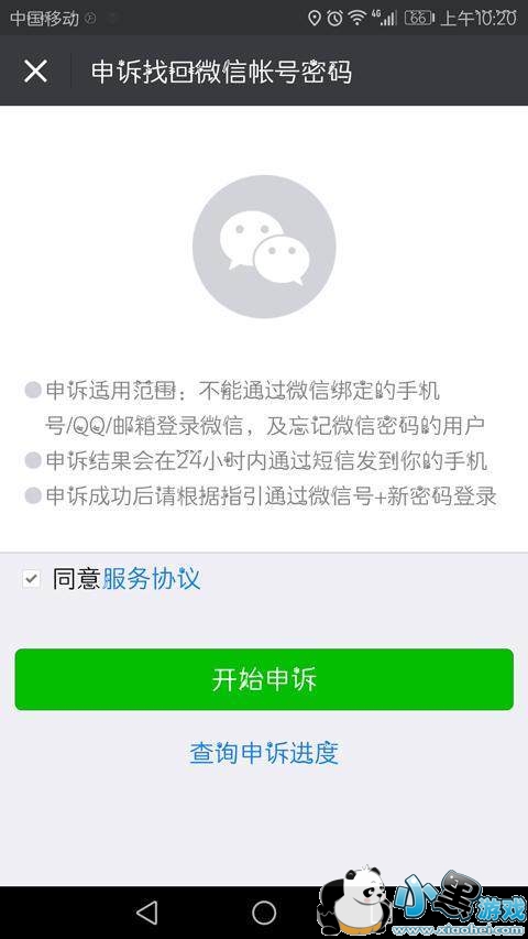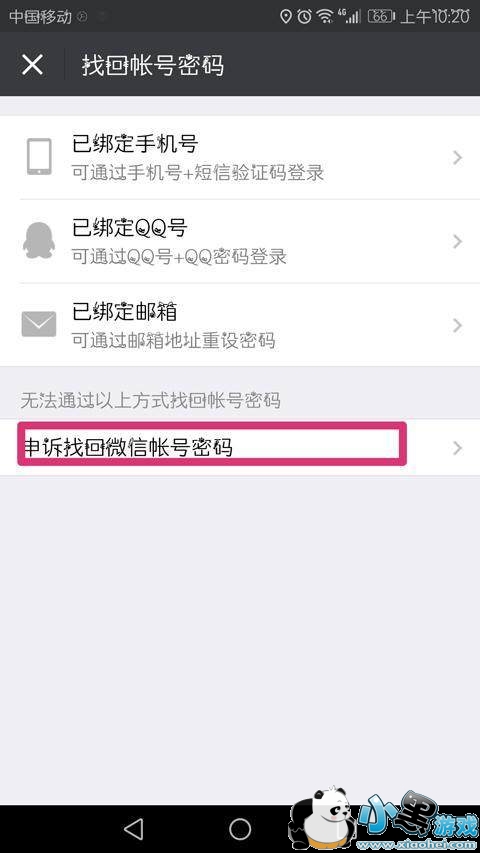 4、然后点击申诉找回微信账号密码。
