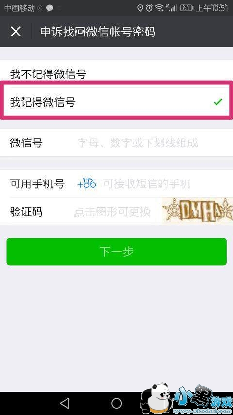 7、选择“我记得微信号”,填写微信号号,并填写一个可用手机号。