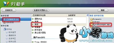 2、将iPhone连接电脑,打开PC端91助手iOS专业版,进入【软件管理】界面,点击【已安装软件】然后点击【微信】最后打开【MicroMessenger.app】。
