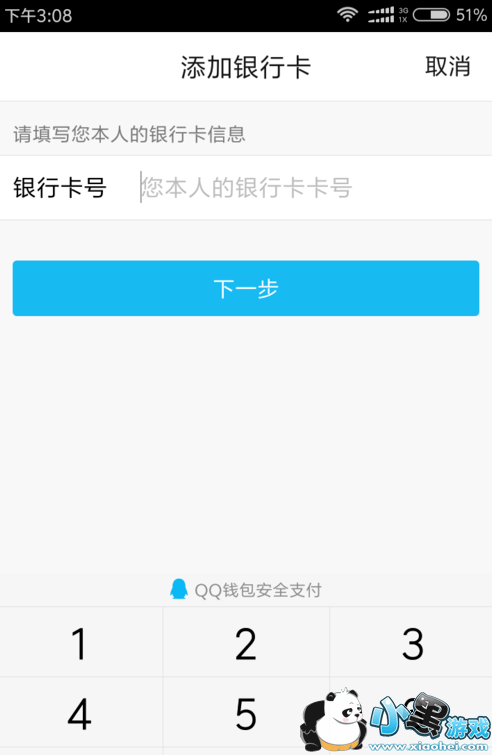 5.点击添加银行卡,弹出一个新的界面,目的是要你输入你的银行卡卡号。点击下一步之后会让你输入你的信息。比如地址、银行预留电话等,你按照提示的进行填写,填写好之后点击下一步。