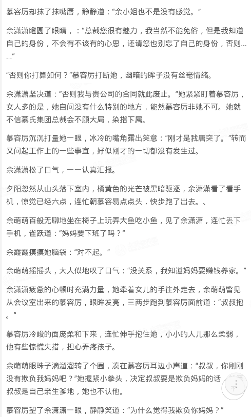 余萌萌百般无聊地坐在椅子上玩弄大鱼吃小鱼,见了余潇潇,连忙丢下手机,雀跃道:“妈妈要下班了吗?”