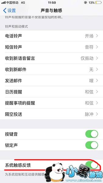 9、在最下面找到【系统触感反馈】打开,之后先关机重启。