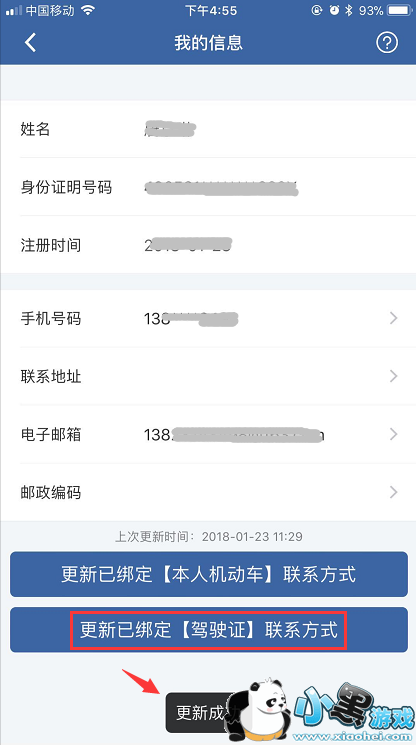 6、返回我的信息页面,点击【更新已绑定(驾驶证)联系方式】,页面提示更新成功,手机号修改操作完成。