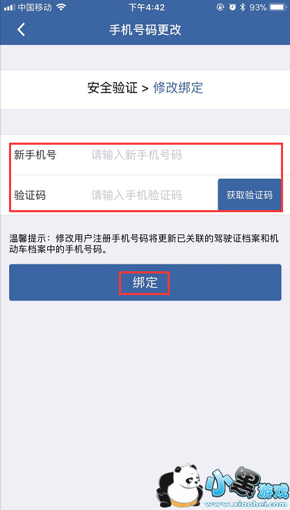 5、输入新手机号码,点击【获取验证码】,点击【绑定】。