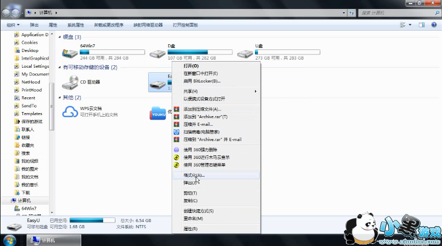 1、鼠标右键点击U盘,在弹出的菜单中,我们需要选择格式化。
