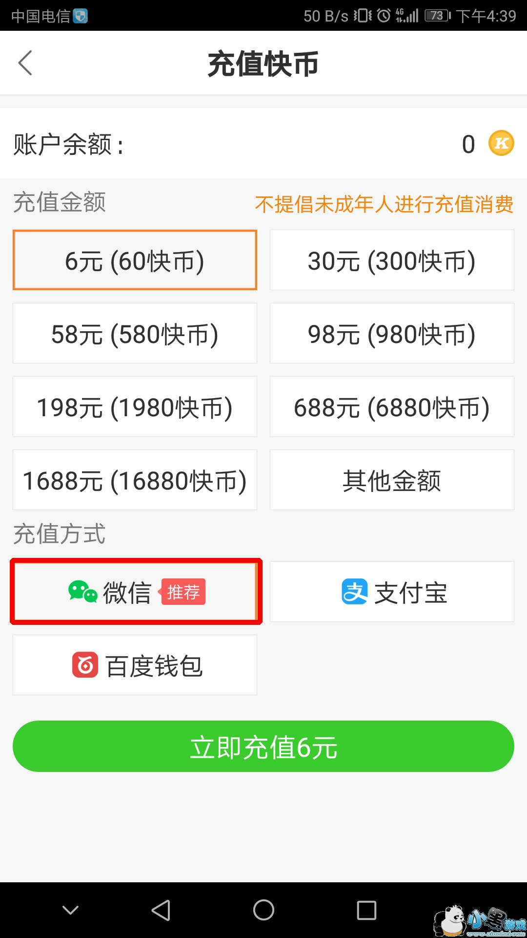 3、点击完成后,我们就可以看到【充值快币】,我们点击它,在新的页面我们就可以选择用微信去支付了。