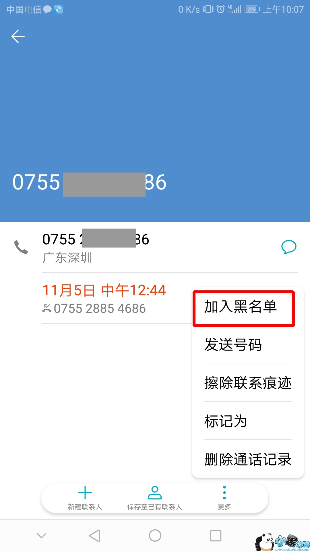 3、然后我们就可以点击【加入黑名单】,这样就把电话号码加入黑名单了。