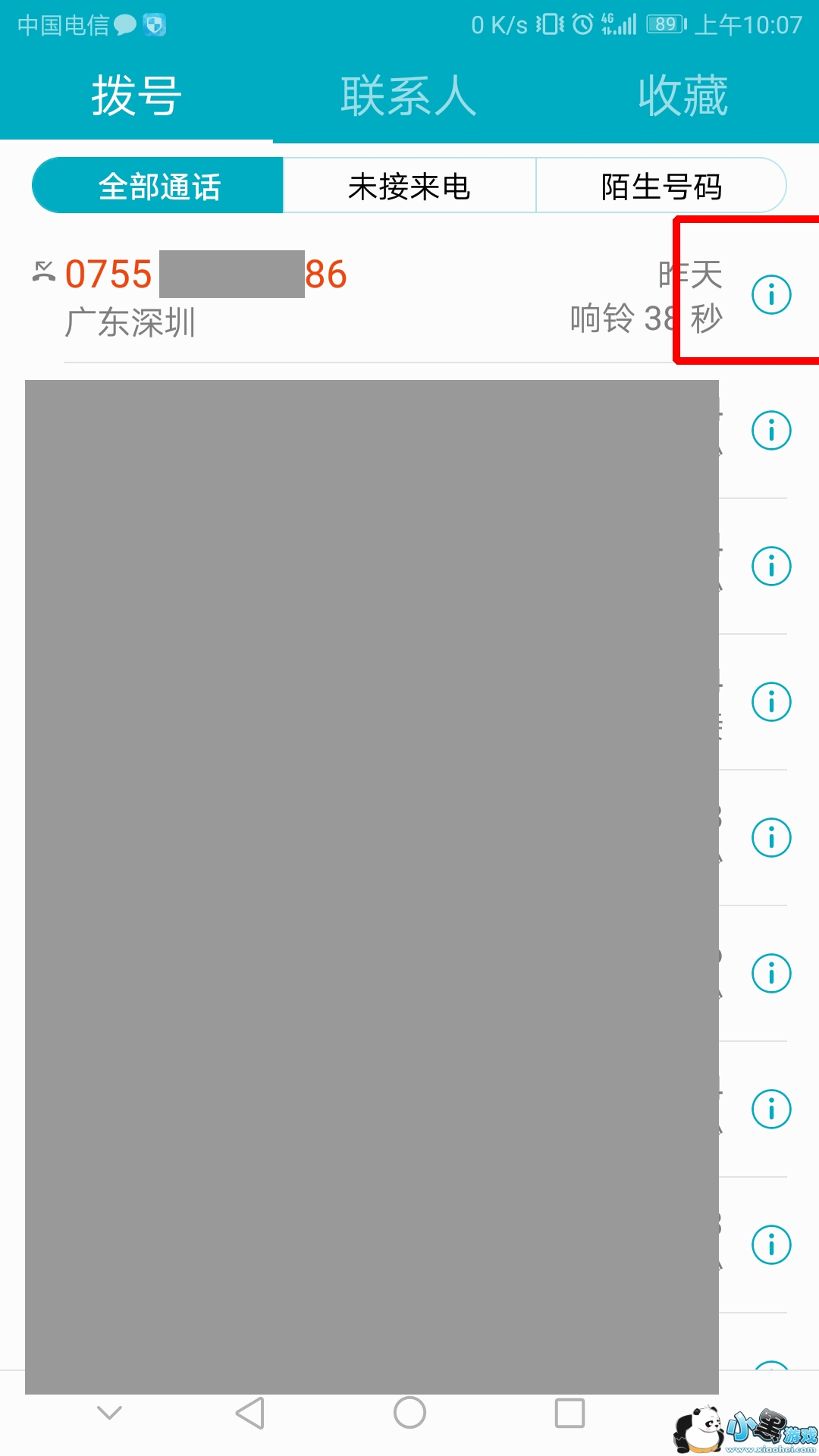 1、首先我们打开我们的通话记录,查找到我们想要拉黑的电话号码。点击电话号码后面的【!】符号。