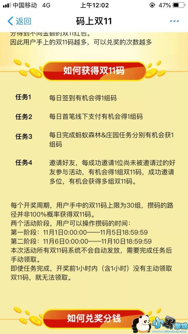 如何得码:有五种方式 1. 每日签到 2. 线下支付宝 3.每日蚂蚁森林浇水 4.每日蚂蚁庄园答题 5.邀请好友 以上五种方式都能有机会获得码上双11兑奖码!