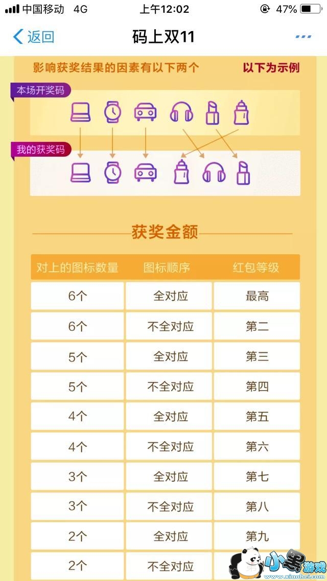 奖项设置:10个奖项红包等级 每组双11码由6个商品图标和1个礼盒彩蛋组成,图标和彩蛋都可以兑奖。 红包等级一等
