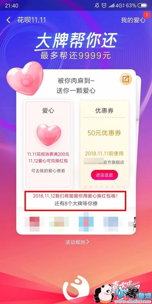 如果成功的话就可以收到1课爱心,还有可能收到店铺优惠券噢,在下方还有提示你还可以参加几个大牌的活动,向左滑屏就可以参加其他的8家品牌活动。