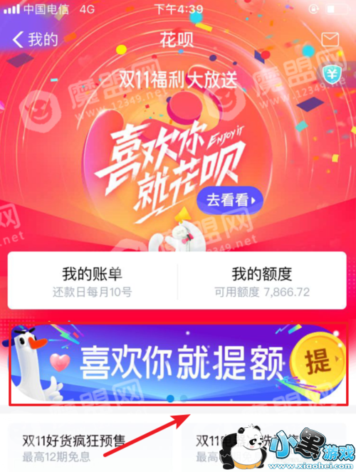 在花呗内,可以看到提额的轮播图。我们点击页面中的图片进入提额界面。