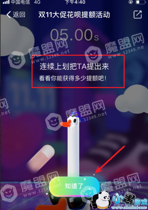 点击后,页面会提示游戏的玩法,需要连续往上滑动屏幕。我们点击知道了进入游戏。