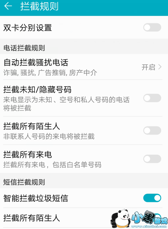4、我们点击【拦截规则】在这里我么可以设置【短信拦截规则】,打开规则就可以自动拦截了。