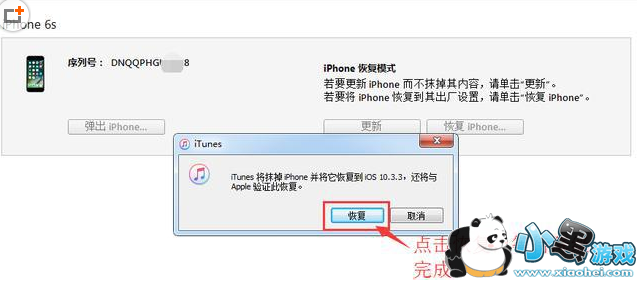 3、然后iTunes会进行降级的提示,软件会抹掉手机中ios11的所有数据并且将系统降级到ios10.3.3。我们点击【恢复】
