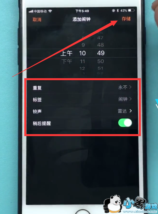 4、然后我们在编辑闹钟界面,调整好相关内容,之后我们点击右上方的【存储】就可以保存刚刚设置的闹钟了。