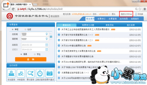 1、首先我们在电脑上打开12306网站,然后输入我们的账号和密码登录,然后点击右上方的【我的12306】