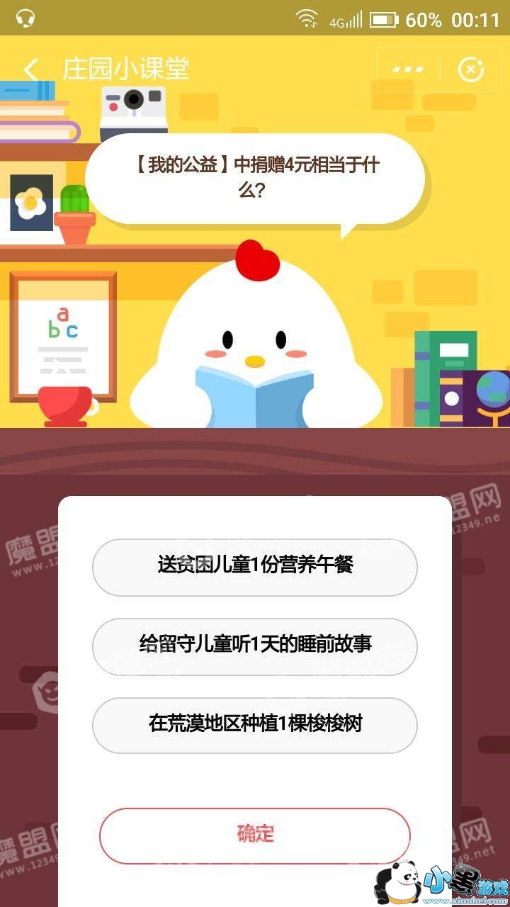 【我的公益】中捐赠4元相当于什么?这是蚂蚁庄园今日11月15日的问题,很多玩家不清楚正确答案是什么,本文小编会为大家详细介绍,感兴趣的小伙伴们,一起来看看吧!