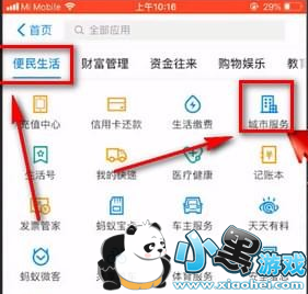 2、然后我们点击上方的【便民生活】之后我们点击【城市服务】