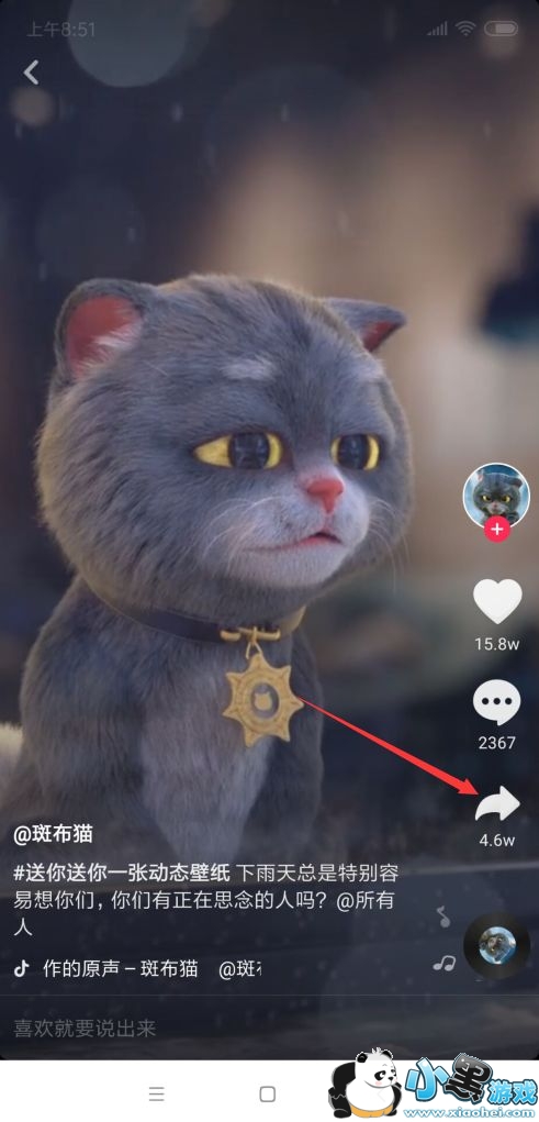 这个壁纸可以直接在抖音里设置,首先在抖音中搜索“斑布猫”,找到这个作品点分享