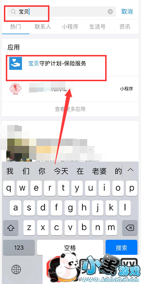 2.在搜索框输入宝贝,在弹出的候选结果中点击应用--宝贝守护计划,如下图所示