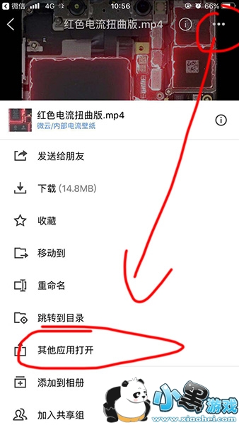 2、然后将下载好的视频打开点击右上角的【三个点】,选择【其他应用打开】;