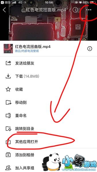 1、首先将你要作为壁纸的视频下载到微云盘中,然后在微云盘中打开视频,点击右上角的【三个点】选择【其他应用打开】