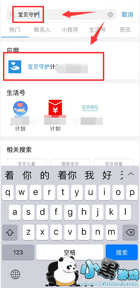 搜索界面,点击最上面的搜索框,输入宝贝守护,点击应用进入,如下图所示