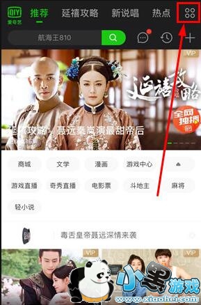 1、首先在手机上打开爱奇艺APP,进入到主界面后,点击右上角红框标注内的“导航”选项,如下图: