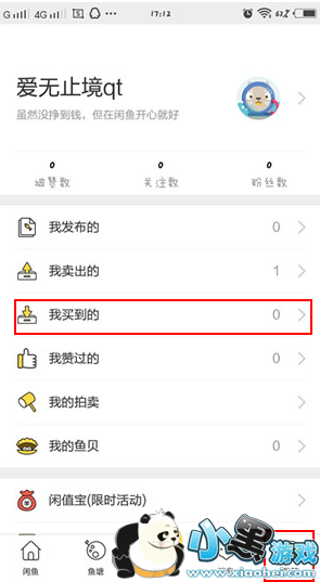 1、打开手机上面的闲鱼软件,在“我的”界面找到“我买到的”行列。