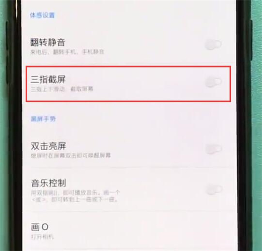3、在体感手势界面,找到【三指截屏】选项,点击打开即可