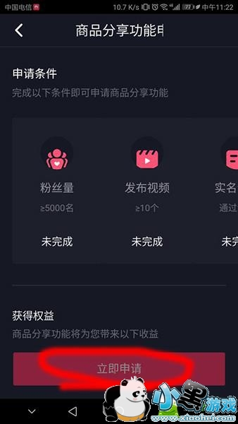 申请条件:1、粉丝量大于5000名,2、发布视频大于10个,3、实名认证。满足这三个条件之后就可以开通了。