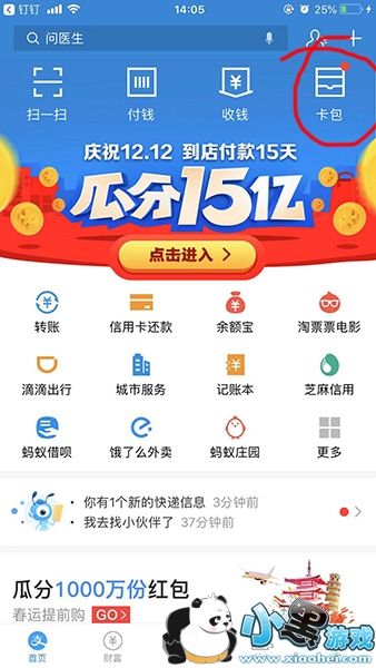 1、打开支付宝在首页中的顶部就可以看到【卡包】