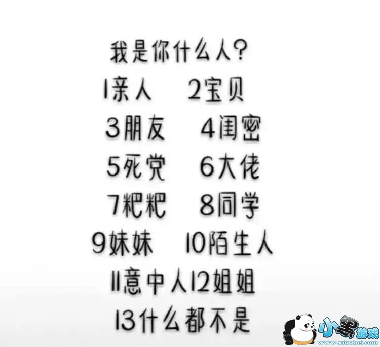 抖音中有很多非常有个性的壁纸,最近一张“我是你什么人”的手机壁纸也非常受用户的喜欢,里面总共有13个选项,从亲人到什么也不是,最后这个什么也不是也是挺扎心的,下面也为大家收集了这张图片,喜欢的记得保存下来吧。