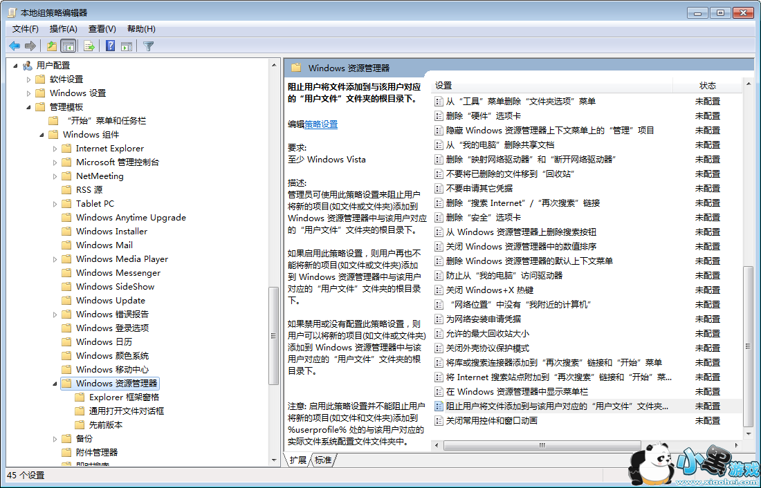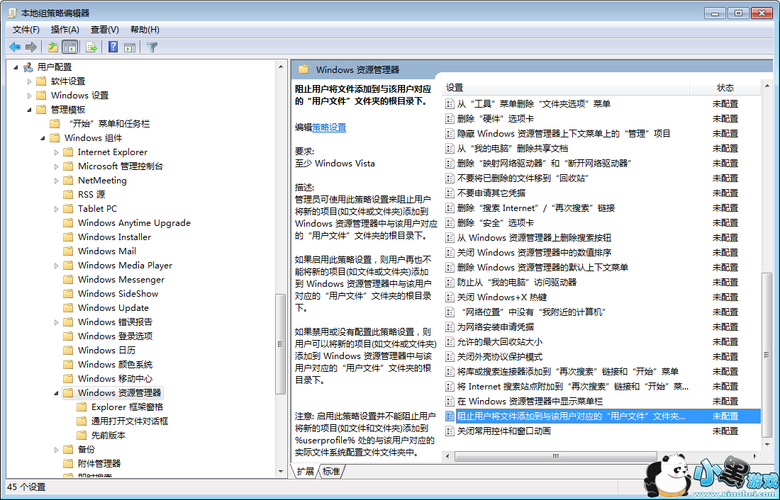 3、双击右侧的“阻止用户将文件添加到与该用户对应的‘用户文件’文件夹的根目录下”。