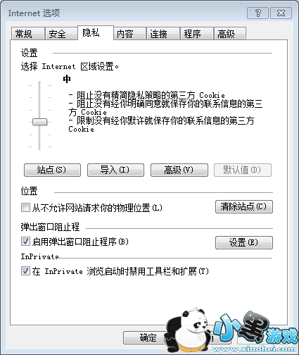 2、在打开的Internet选项窗口中,单击“隐私”,其中有一栏是弹出窗口阻止程序,在底下勾选过的(启用弹出窗口阻止程序)那栏将勾取消,单击底下的(确定)。
