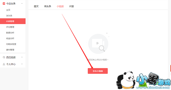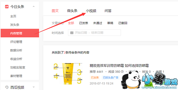 2、登陆之后在“今日头条”栏目下选择【内容管理】,然后选择【小视频】;