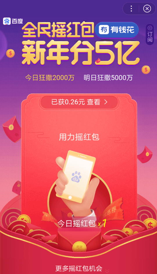 为了迎接新年的到来,百度在最近上线了全民摇红包活动,用户有机会在其中瓜分领取5亿的红包奖励。下面小编就为大家带来百度全民摇红包活动攻略。感兴趣的小伙伴们随小编一起来看看吧,希望对大家能有所帮助。