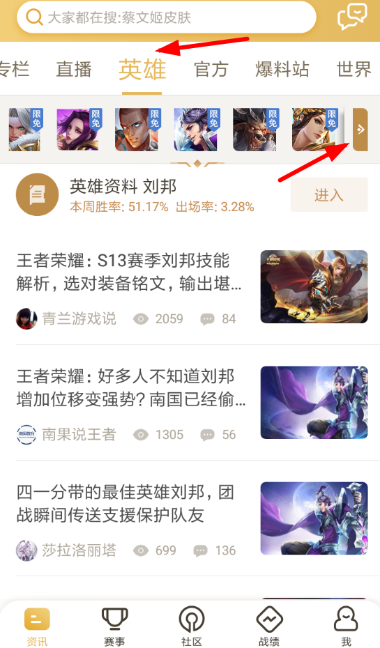 1、若是想要查看王者荣耀的英雄排行,大家需要在王者营地资讯页面选择“英雄”分类,点击右侧的箭头按钮(如下所示)查看英雄排行榜。