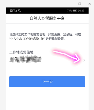 第二步:点击进入“个人所得税”APP,选择工作地或常住地,再点击下一步。