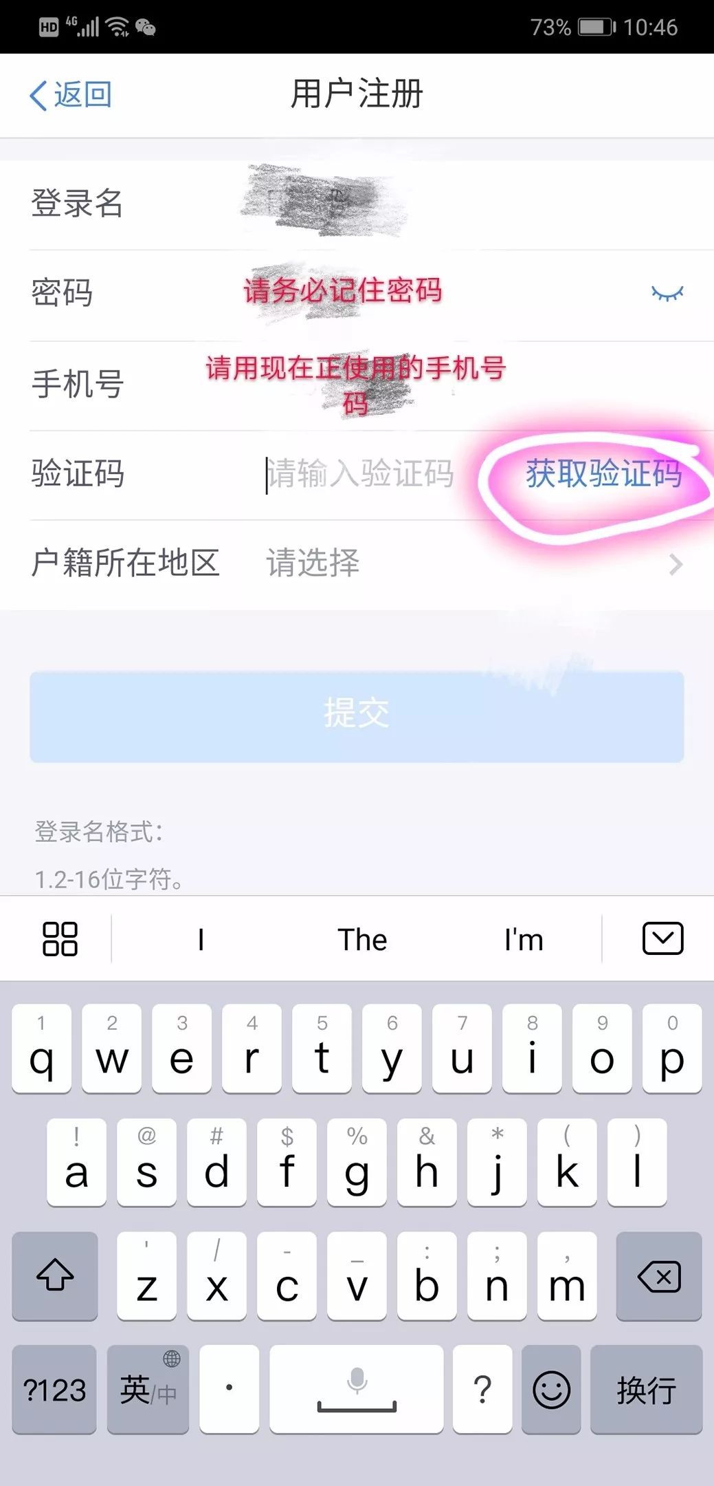 7、根据要求输入登录名——密码——手机号码——点击“获取验证码”——输入验证码——选择户籍所在地区——点击“提交”;