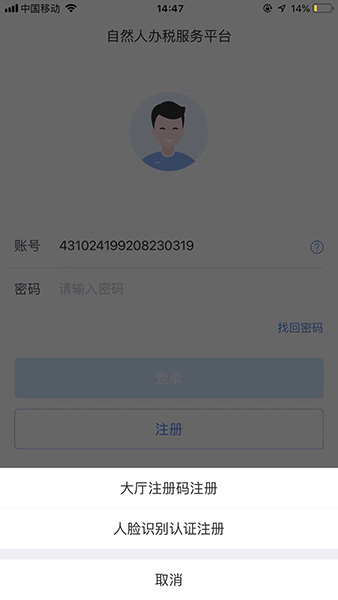 3、之后可以选择【大厅注册码注册】或者是【人脸识别认证注册】;