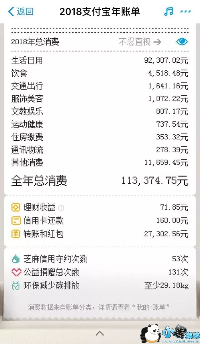 还有一个细节那就是支付宝2018年度账单最后的总结一页,我们2018总消费有一个字样【不忍直视】字样,是个眼睛的形状隐藏数字,在账单信息中,支付宝在年账单中选择了统计类数据,避免出现类似于“第一笔交易”、“转账最多的人”等颗粒度过细的纬度。