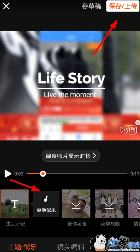 3、在这之后,从下方的列表里添加配乐并且完成镜头的编辑,我们就可以通过右上角按钮保存上传作品了,非常方便快捷!