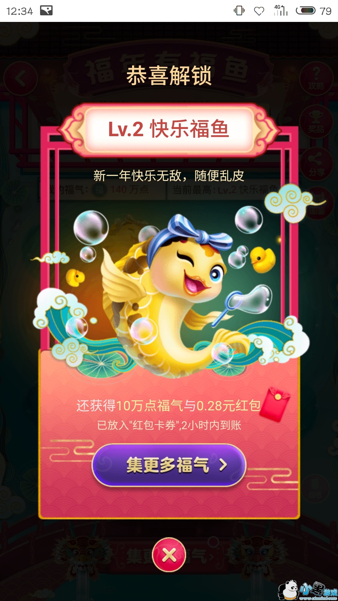 用户可在互动主界面点击”召唤福鱼“按钮或进入”图鉴”召唤,当持有足够数量的福气即可消耗一定数量福气进行福鱼召唤,召唤后获得的福鱼会出现在互动主界面。将互动主界面的两个相同等级的福鱼拖动到一起合成,即可解锁更高等级的福鱼。用户成功解锁后,有机会获得红包。