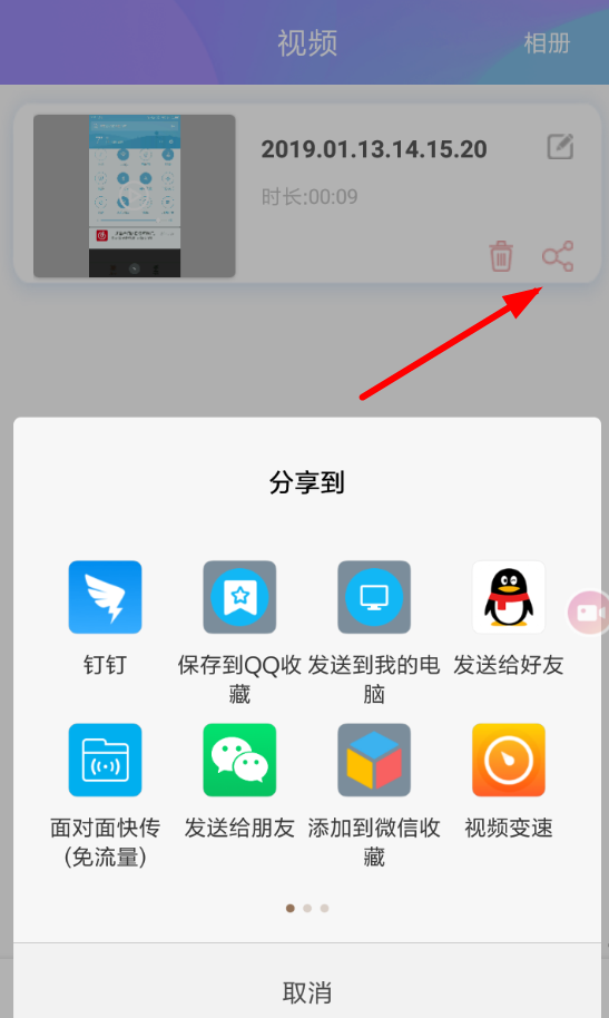3、如此一来,从视频文件的右下角找到“分享”按钮(如下所示),我们就可以把视频分享到QQ、电脑、微信、朋友圈等地方。