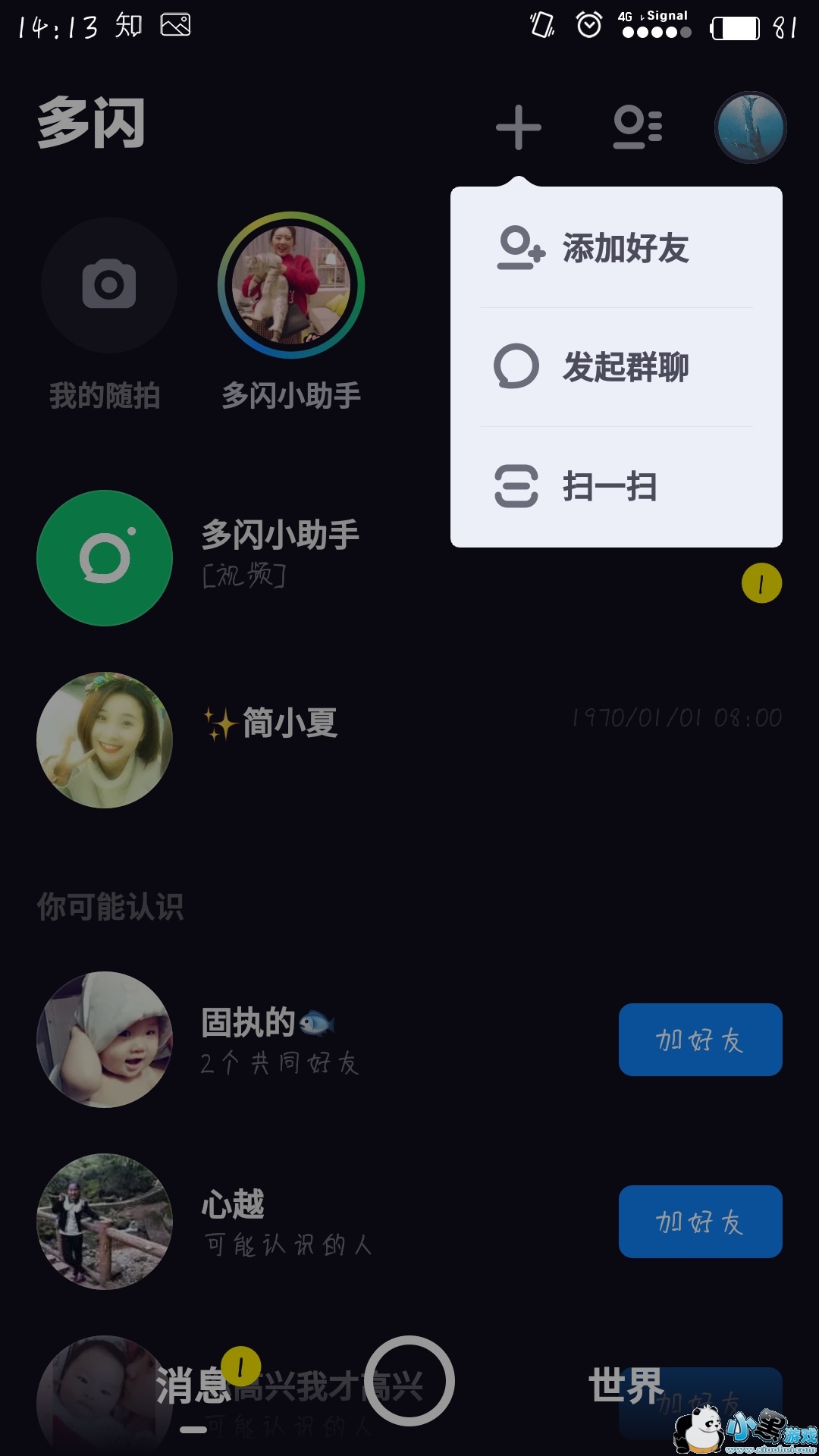 1、打开多闪APP,点击右上方的“+”号,选择“添加好友”。